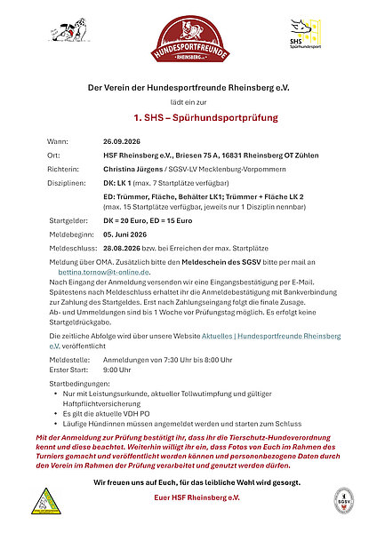 Wir richten am Sonnabend den 26. September 2026 unsere erste Spürhundsport-Prüfung aus.