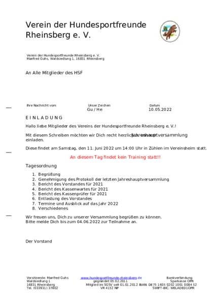 Hallo liebe Mitglieder des Vereins der Hundesportfreunde Rheinsberg e. V.!